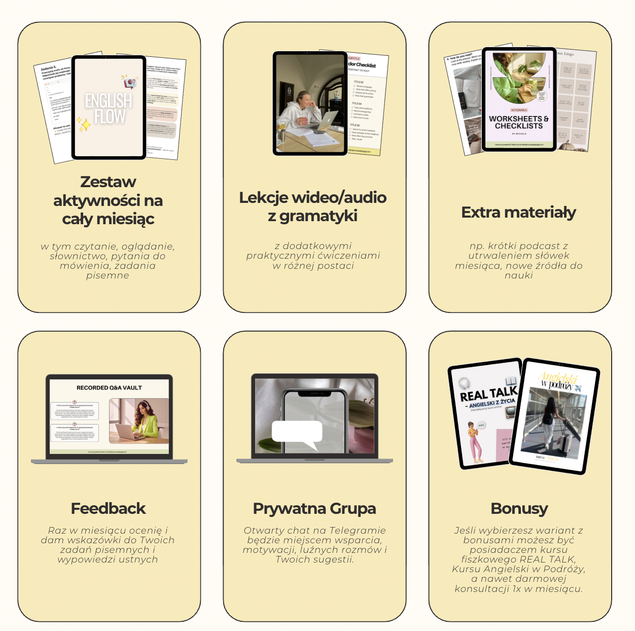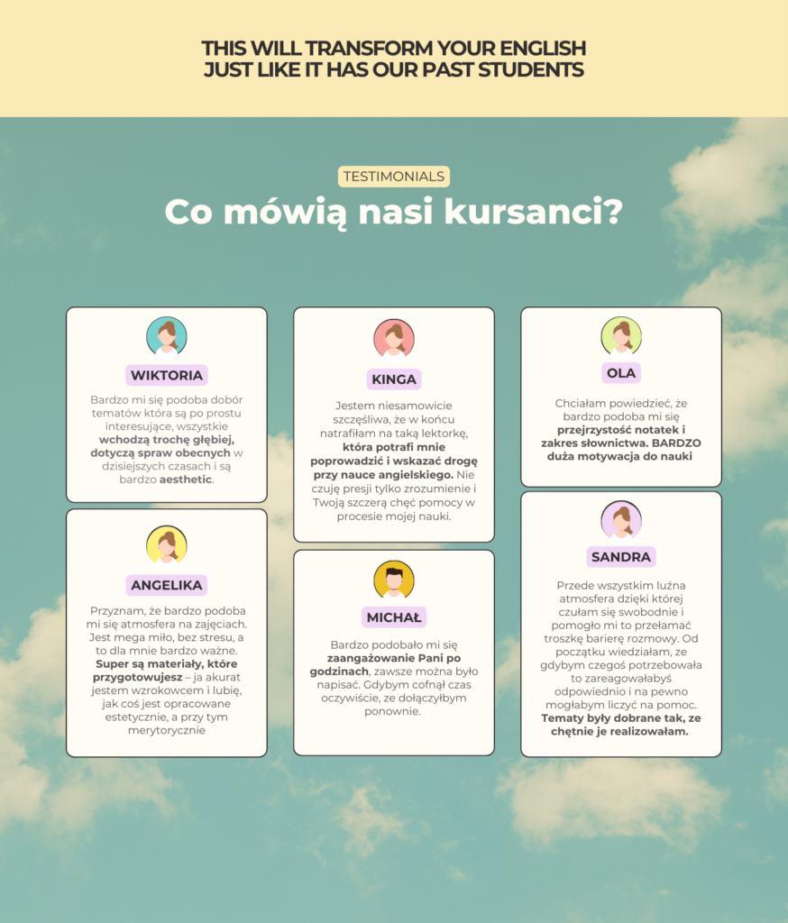 🗣️ indywidualna konsultacja 1:1 raz w miesiącu – możemy zrobić lekcję konwersacyjną, popracować nad konkretnym zagadnieniem lub poćwiczyć coś co sprawia Ci w angielskim problem.